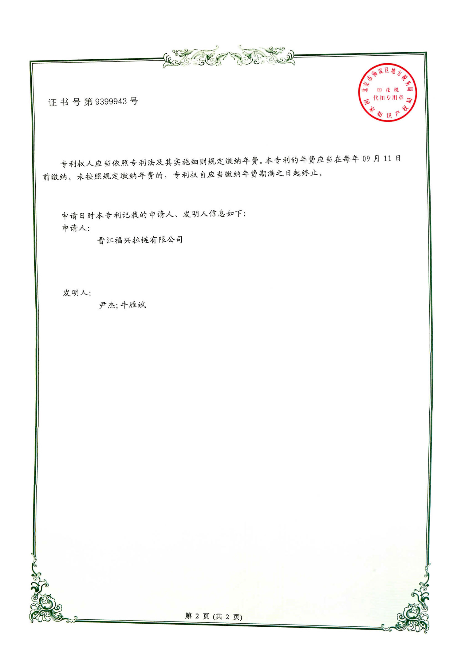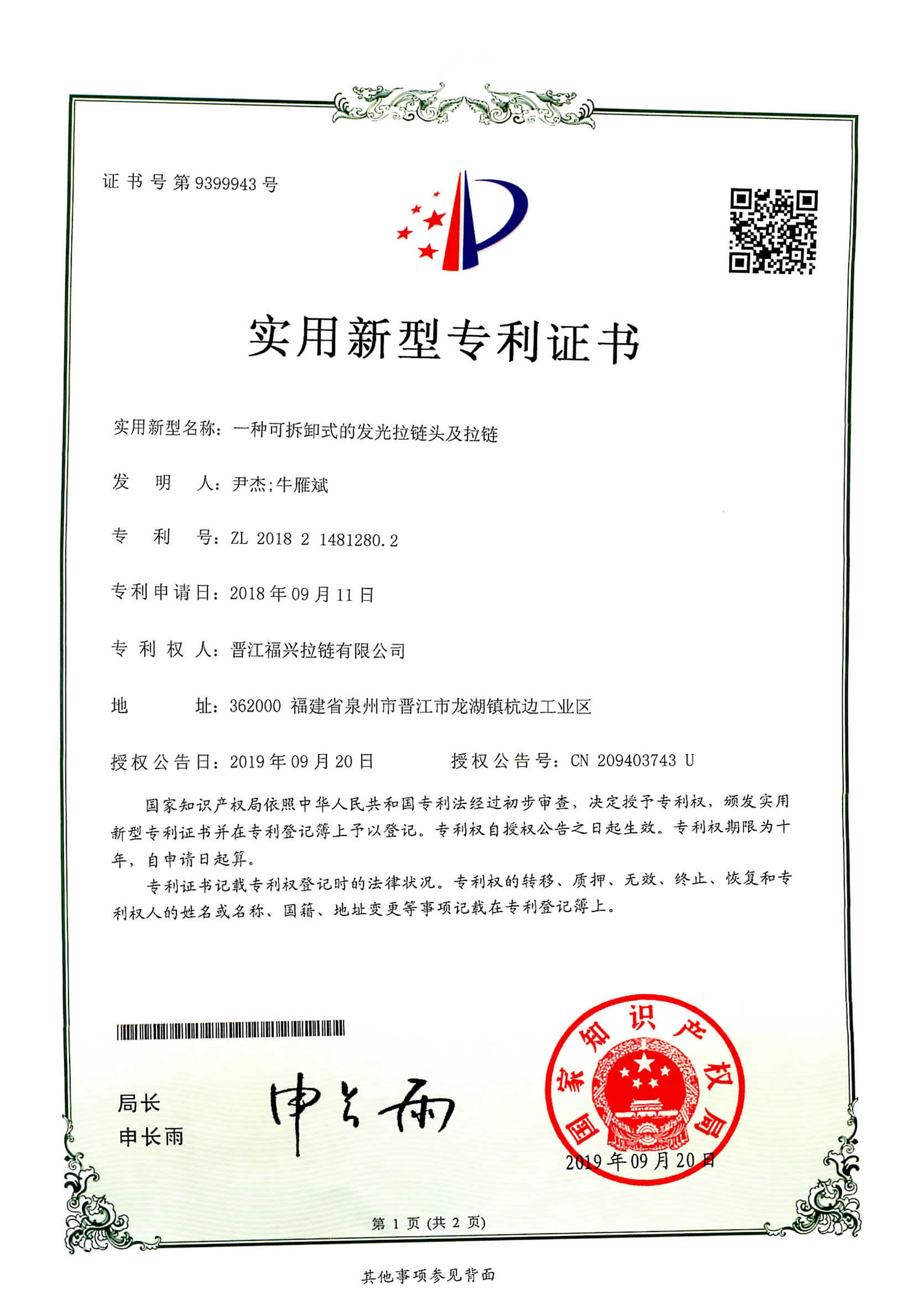 实用新型发明专利(第399943号)