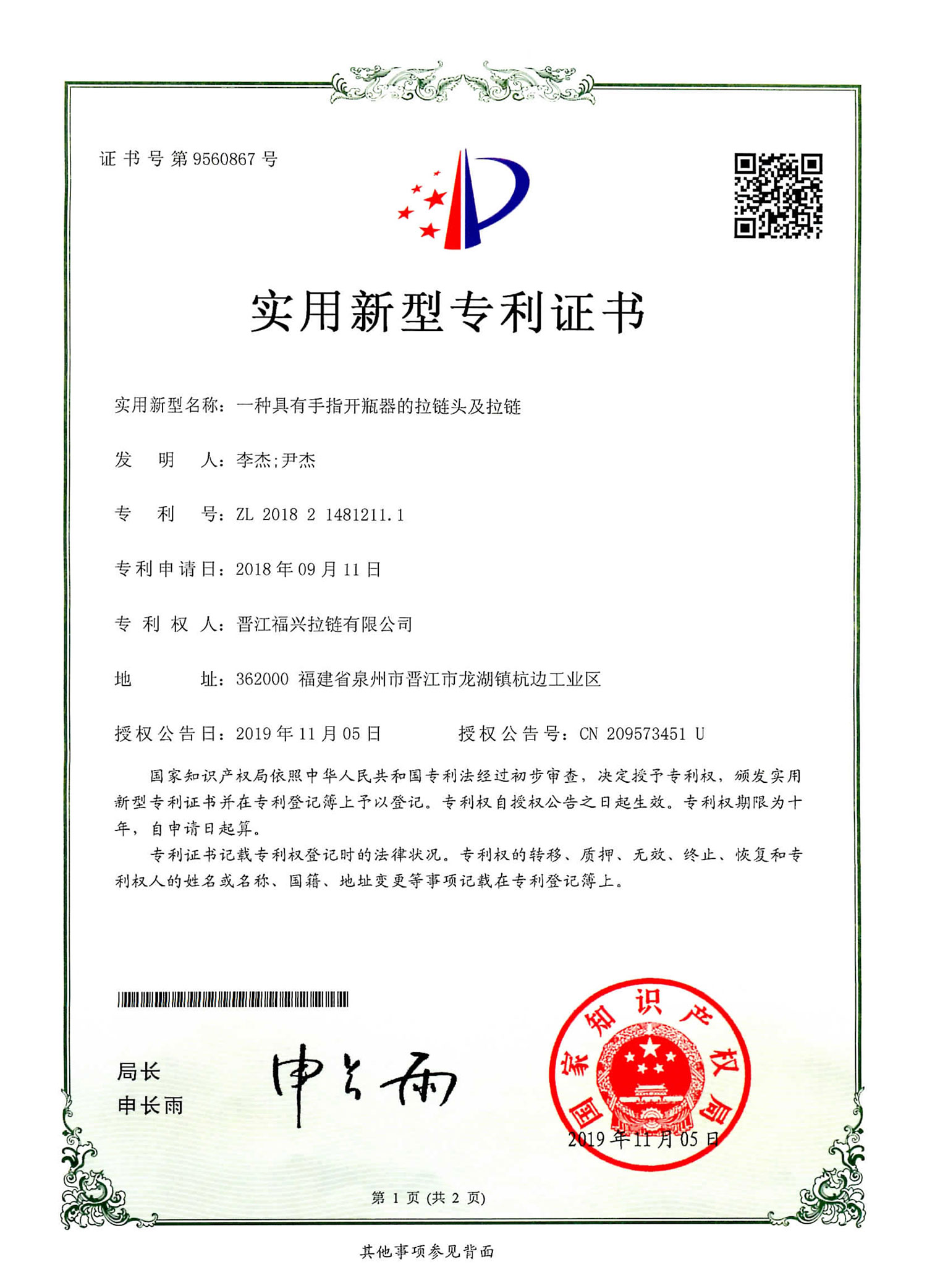 实用新型发明专利(第9402779号)
